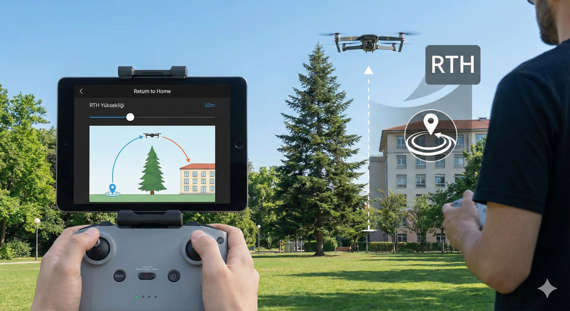 Cihazın bağlantısı koparsa veya şarjı biterse başladığı noktaya güvenle dönebilmesi için RTH (Return to Home) yüksekliğini, çevredeki en yüksek engelden (ağaç, bina vb.) daha yükseğe ayarlamayı unutmayın.